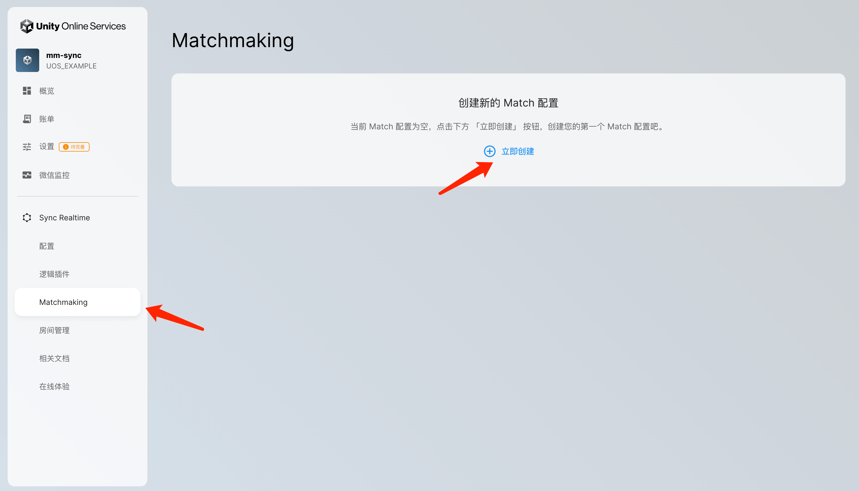 请确保您已经 创建 UOS APP 并开启 Sync 服务,进入「项目设置」页面,点击启用「Matchmaking」功能,并进行确认。