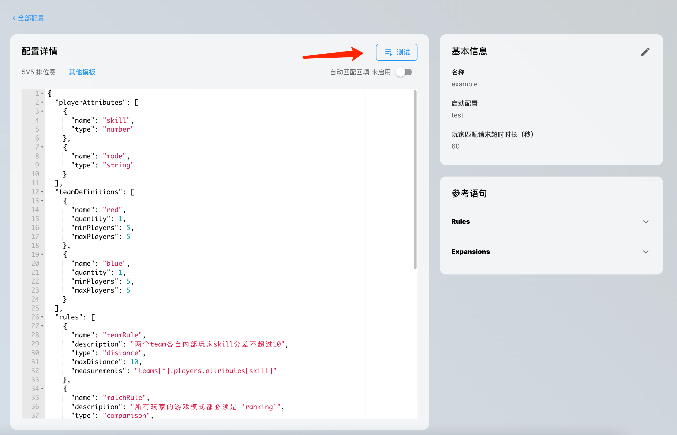 我们基于市面上常见的游戏玩法及其匹配机制为用户事先准备了一系列的 Match 配置的模板。在本教程中,我们以「5v5排位赛」的玩法匹配模板为例进行说明。选择了相应的模板后,点击「创建」之后,就可以创建相应的 Match 配置。