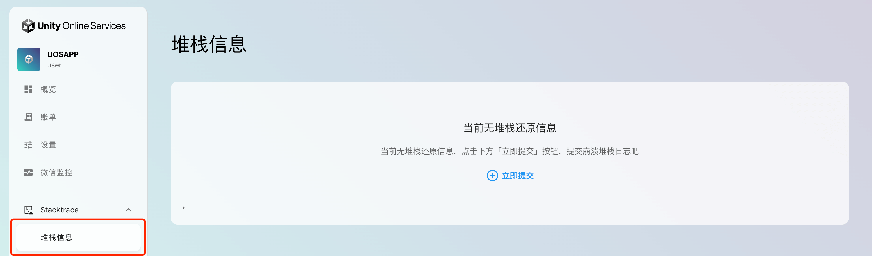请确保您已经 创建 UOS APP 并开启 Stacktrace 服务,进入 「Stacktrace -> 堆栈信息」 页面。
